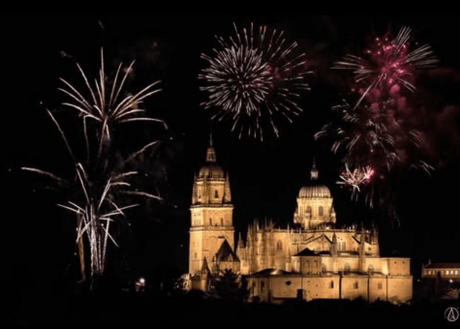 La fotografía de hoy es de Álex Peña. Imagen nocturna de los fuegos artificiales sobre la Catedral de Salamanca en estos días de Ferias y Fiestas de la ciudad.