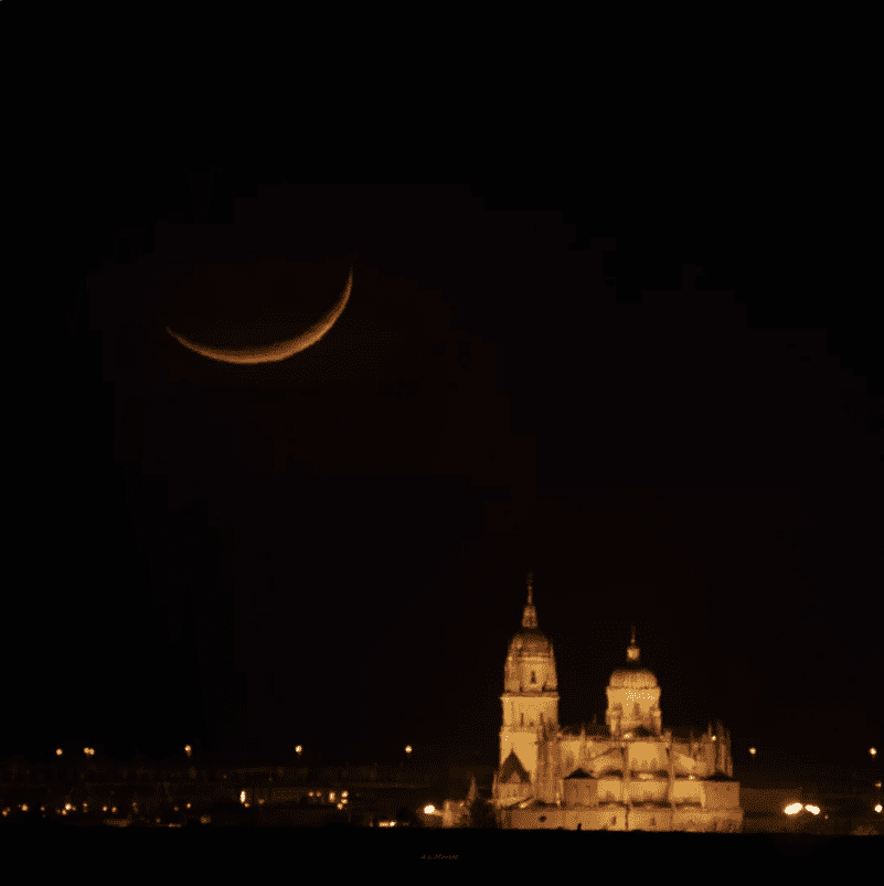 La fotografía de hoy es de Álvaro López. Imagen nocturna de la luna bajo la Catedral de Salamanca.