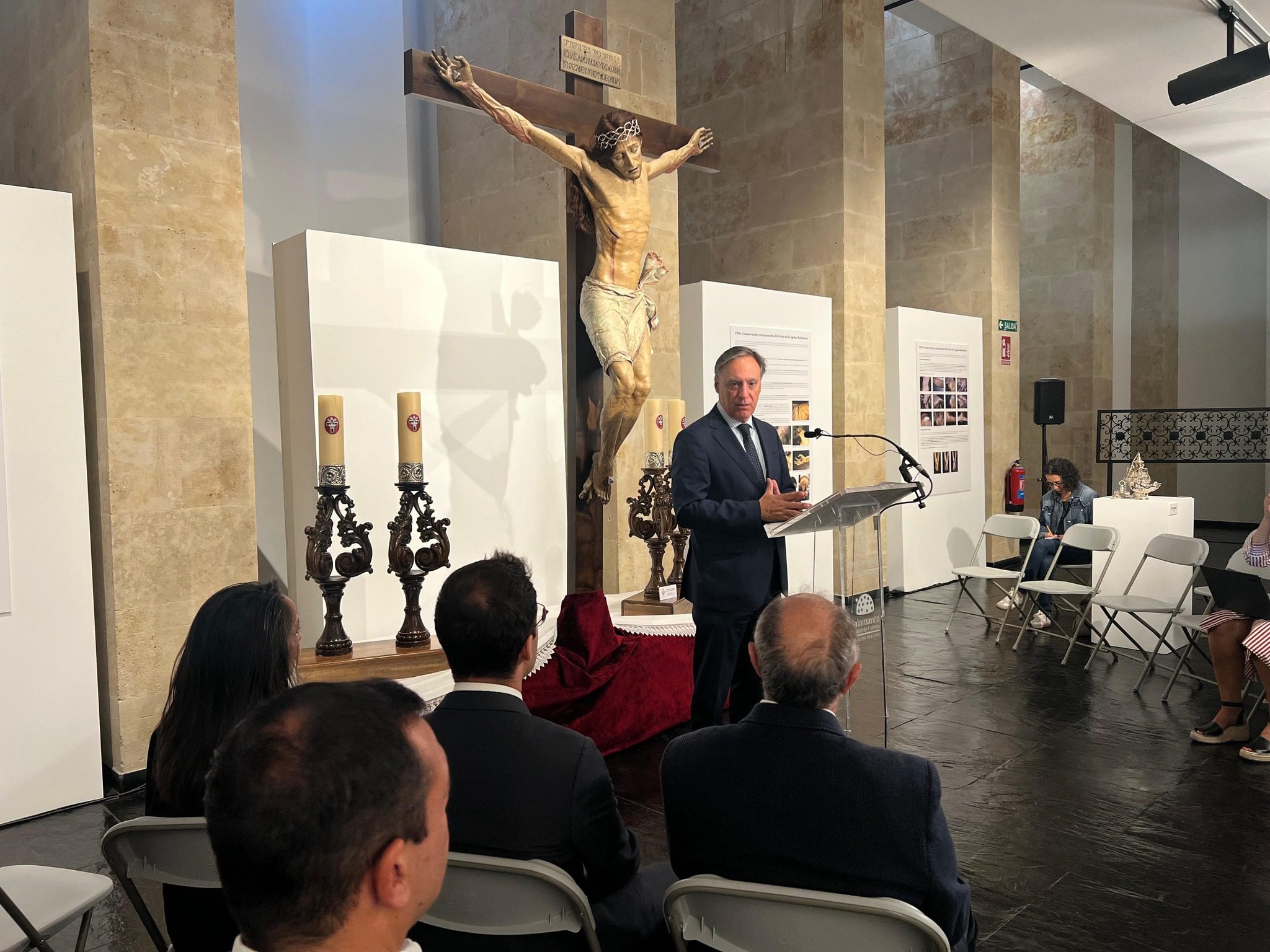 Finalmente, García ha agradecido el esfuerzo de la cofradía, de su hermano mayor, Roberto Sánchez, y del comisario de la muestra, Julián Alcántara, “por acercar al público esta portentosa imagen a través de esta exposición”, que se podrá visitar hasta el próximo 25 de octubre. Según ha señalado, “esta muestra es un acto de gratitud hacia quienes durante cinco siglos han custodiado esta imagen, y también una oportunidad para que los salmantinos y visitantes se acerquen a la talla del Cristo de la Agonía Redentora desde distintas perspectivas: la fe, la devoción, la historia, el arte y la tradición”.