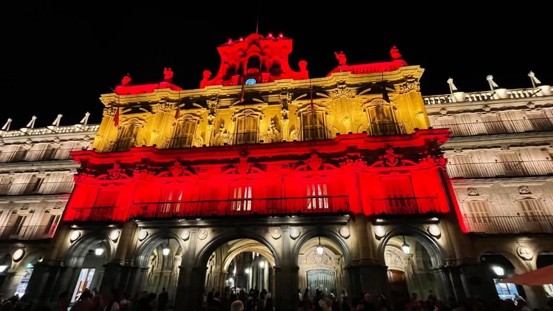 La fachada del Ayuntamiento de Salamanca en la Plaza Mayor se ilumina un año más con los colores de la bandera de España, con motivo de la Fiesta Nacional del 12 de octubre. En concreto, luce los colores de la enseña nacional desde ayer, y hasta el próximo lunes, 13 de octubre.