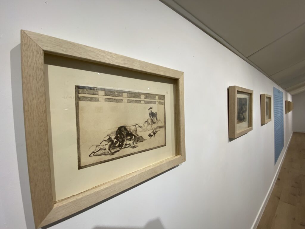 Fuentes ha explicado que “la tauromaquia de Antonio Carnicero tuvo un gran éxito en ventas, incluso más allá de las fronteras españolas, lo que motivó a Goya a plantearse un proyecto similar”. ‘La Tauromaquia de Goya’, ha detallado el comisario de la muestra, “relata la historia y evolución de la tauromaquia, desde sus orígenes hasta los toreros contemporáneos a Goya”. En concreto, podemos encontrar algunos temas representativos como El famoso Martincho poniendo banderillas al quiebro, que muestra la destreza y locura del torero; El Cid Campeador lanceando otro toro en presencia del rey Alfonso el Sabio, que conecta el toreo con la historia heroica española; Desgracias acaecidas en el tendido de la plaza de Madrid, donde el público también sufre, lo que humaniza la tragedia, o la titulada Valor varonil de la célebre Pajuelera en la de Zaragoza, que introduce figuras femeninas, mostrando que el valor y la brutalidad no son exclusivos del hombre.