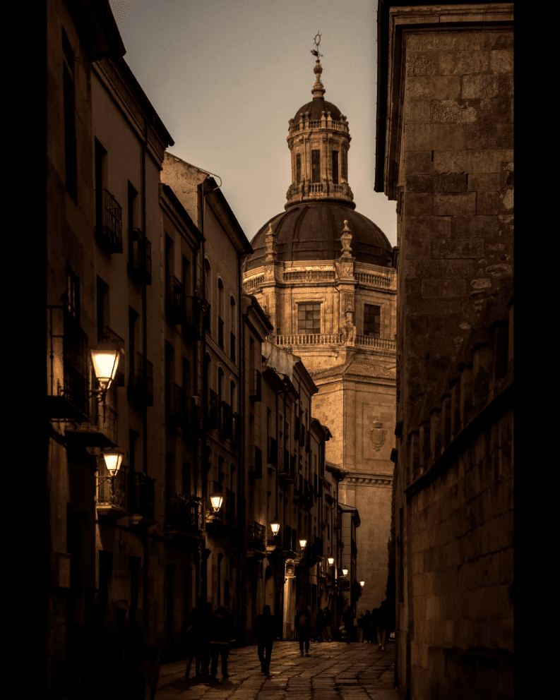 La fotografía de hoy es de Pau Sánchez. Imagen al atardecer desde la calle Libreros de Salamanca.