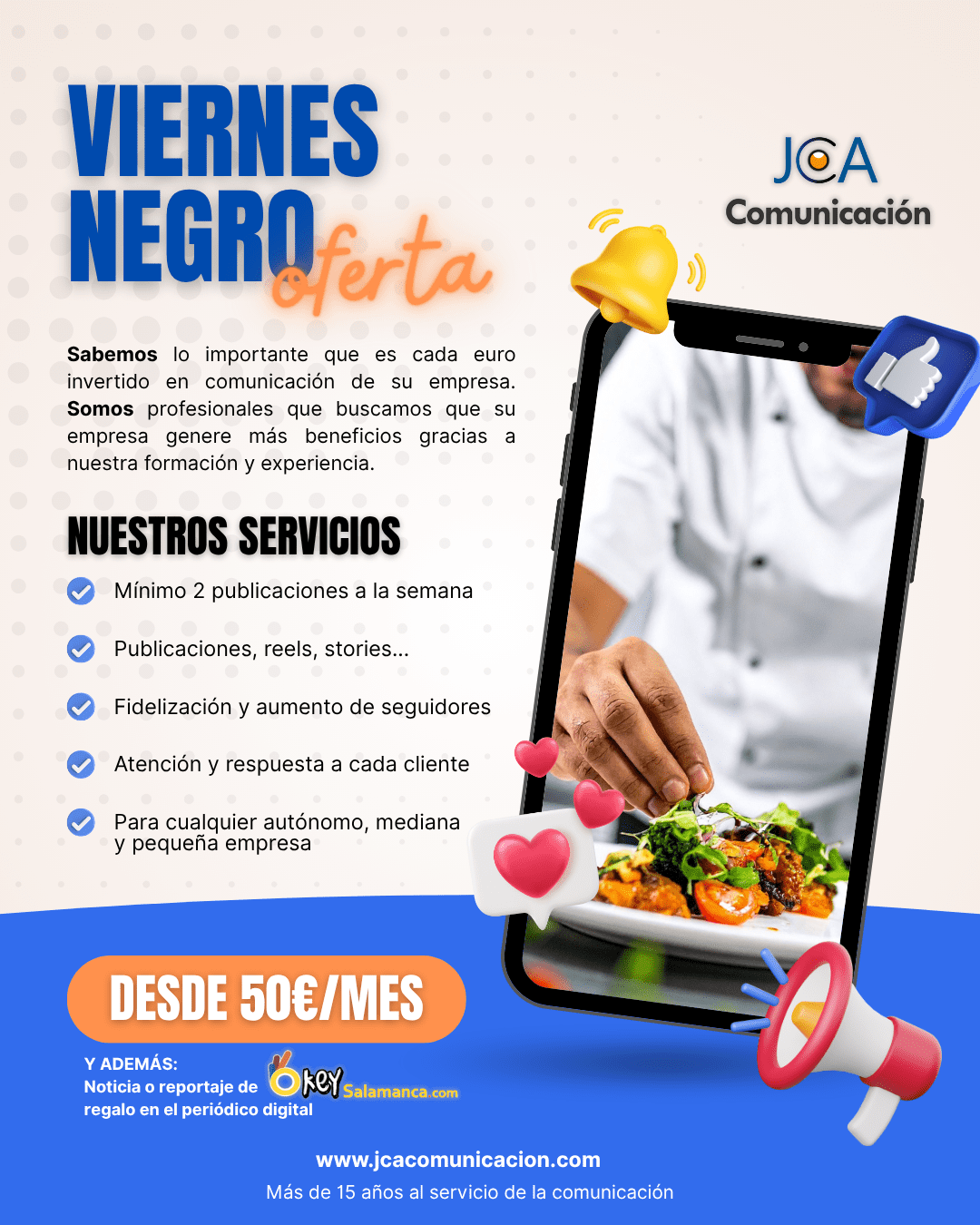 La empresa salmantina JCA Comunicación, especializada en marketing digital y comunicación corporativa, ha lanzado una oferta excepcional por el Viernes Negro destinada a pequeñas y medianas empresas, clubes deportivos y asociaciones. Durante los meses de noviembre y diciembre de 2025, la compañía ofrece la gestión integral de redes sociales desde sólo 50 euros al mes, un precio especialmente reducido para acercar un servicio profesional a cualquier negocio de la provincia.