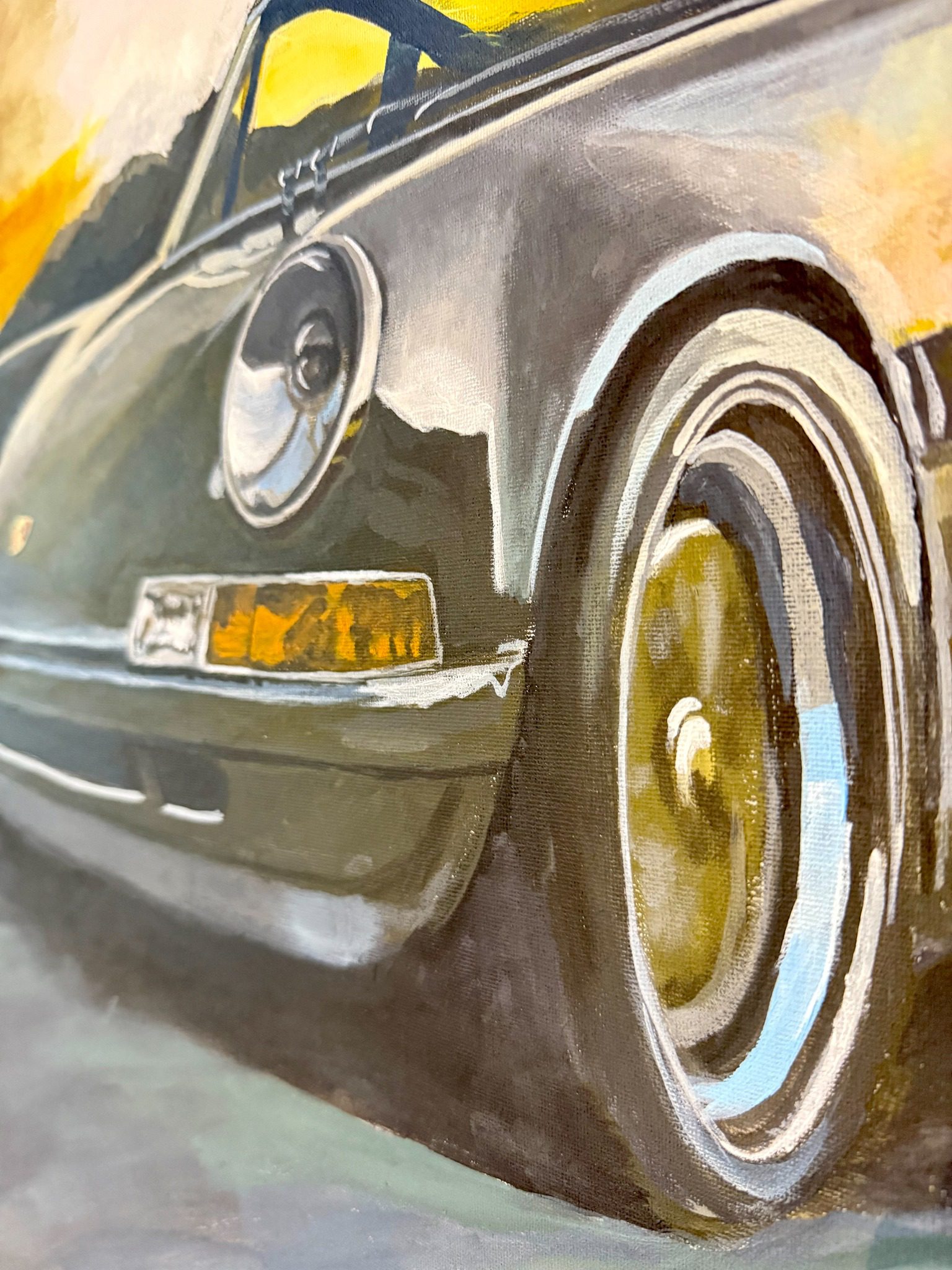 La exposición ‘Motor y Acrílicos’ reúne algunas de sus piezas más representativas, entre ellas las tres primeras obras de la serie ‘Asfalto y Sombras’ (Ferrari F50, Lamborghini Countach y Porsche 911 Turbo 964). En esta serie, el punto de partida es una vista cenital del vehículo, acompañada de la sombra proyectada por la luz solar lateral. La sombra se convierte así en un elemento protagonista dentro de la composición. El artista juega con los contrastes de color, los brillos y la luz que atraviesan las ventanas, detalles que dotan al cuadro de vida y presencia a medida que avanza el proceso pictórico.