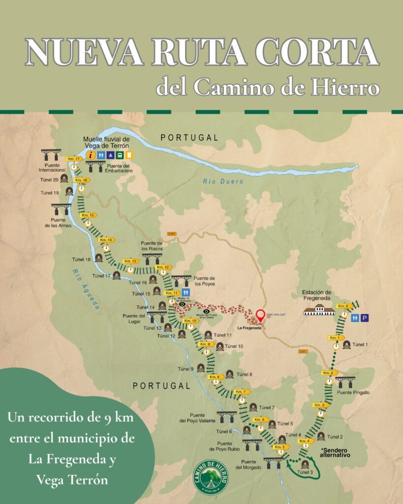 La Ruta Corta parte desde el casco urbano de La Fregeneda, un municipio con marcado carácter fronterizo y un rico patrimonio histórico, y se integra con el trazado original del Camino de Hierro en sus últimos kilómetros hasta el muelle fluvial de Vega Terrón. El itinerario sigue inicialmente el denominado Camino del Río, un sendero que discurre entre almendros, olivos y campos cultivados, y ofrece impresionantes panorámicas sobre los cortados del Águeda, donde también se pueden observar algunas de las infraestructuras ferroviarias más representativas de la antigua Línea del Duero.