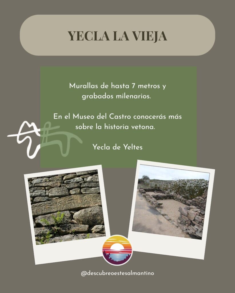 Por su parte, el castro de Yecla la Vieja, también conocido como El Castillo, se alza sobre un espigón natural cerca del arroyo Varlaña. Sus murallas, en parte conservadas, rodean cerca de 5 hectáreas de superficie donde se aprecia la monumentalidad de las fortificaciones prerromanas. El sitio incluye grabados rupestres representando animales como caballos, escenas de caza y figuras humanas, así como evidencia de ocupación romana y medieval.