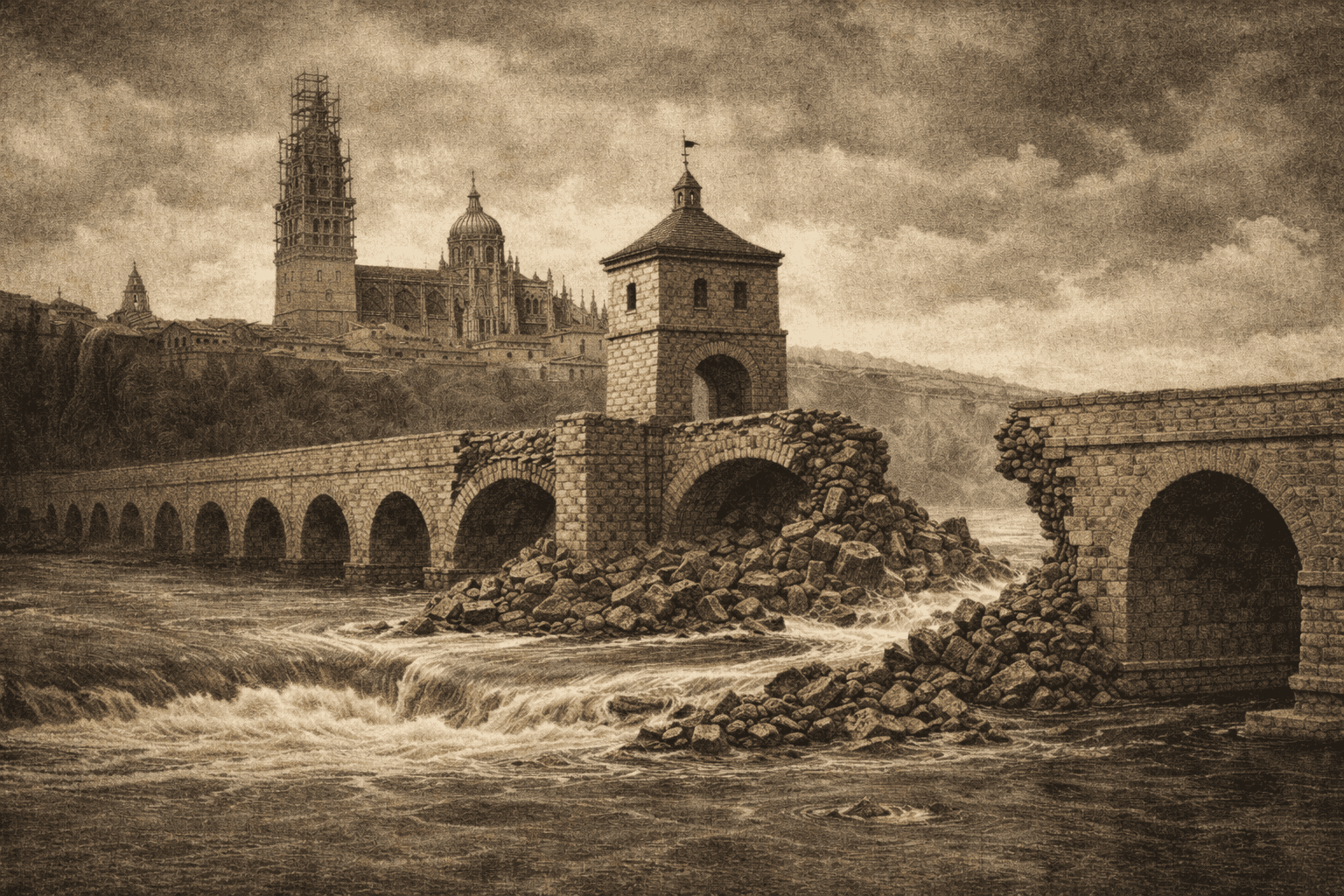 Uno de los símbolos materiales del desastre fue el Puente Romano (Puente Mayor del Tormes). La tradición historiográfica local resume un patrón: el puente queda muy dañado en algunos arcos y se produce un desplome progresivo que se detiene en el castillete central, que actuó como “punto de corte” del colapso.