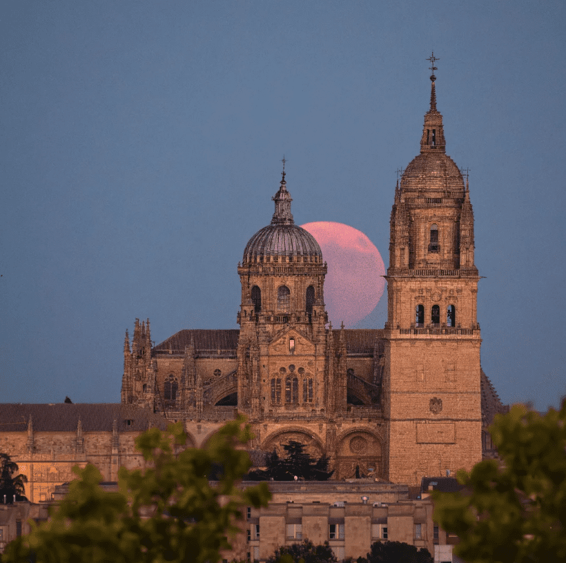 La fotografía de hoy es de Pau Sánchez. Imagen de la Catedral de Salamanca con la luna llena detrás al atardecer.
