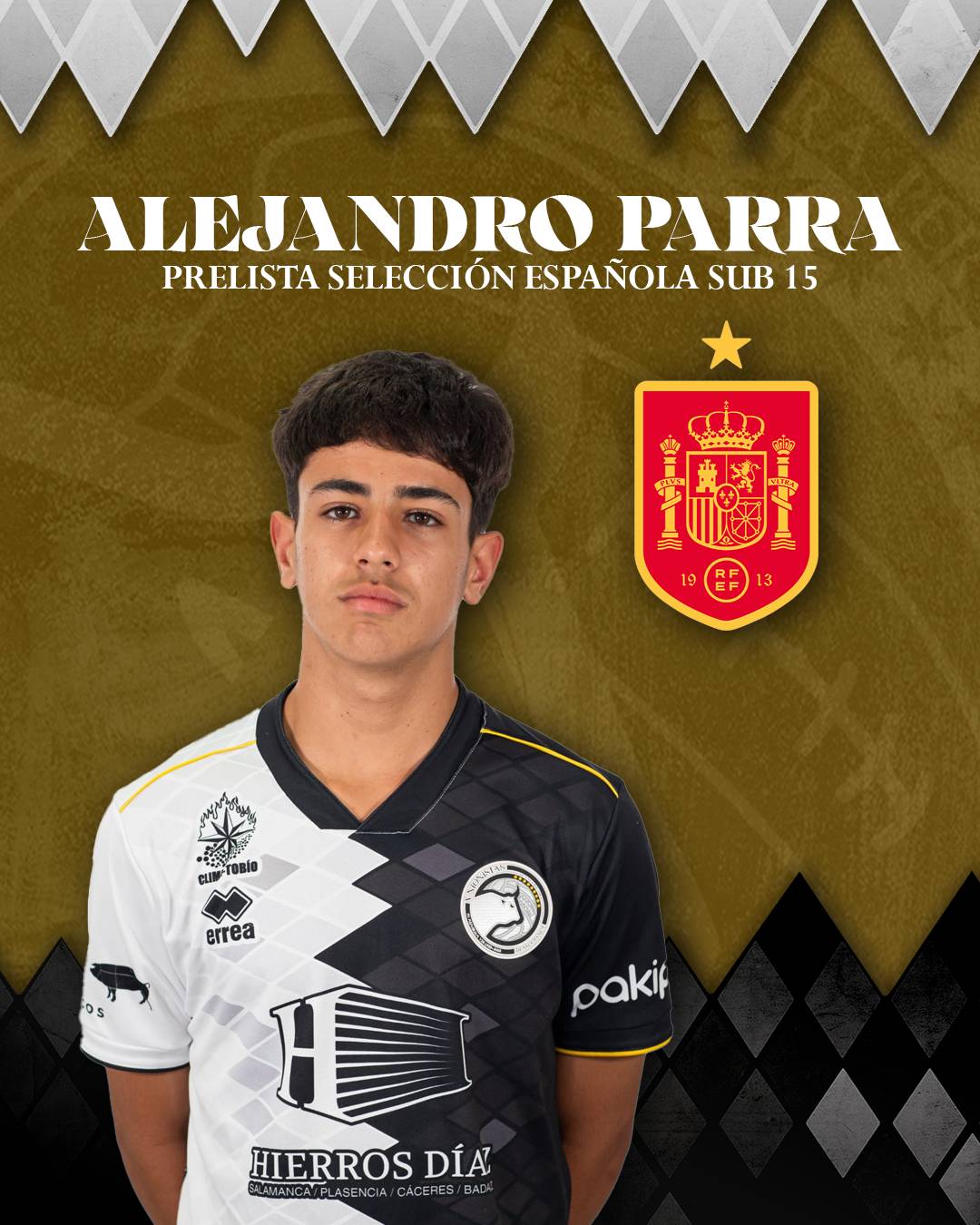 El fútbol base salmantino vuelve a recibir una gran noticia. Alejandro Parra, jugador del Cadete A de Unionistas de Salamanca CF, ha sido incluido en la prelista de la Selección Española Sub-15 para la disputa de dos encuentros amistosos internacionales frente a Italia que se celebrarán en Roma los próximos 3 y 5 de marzo.