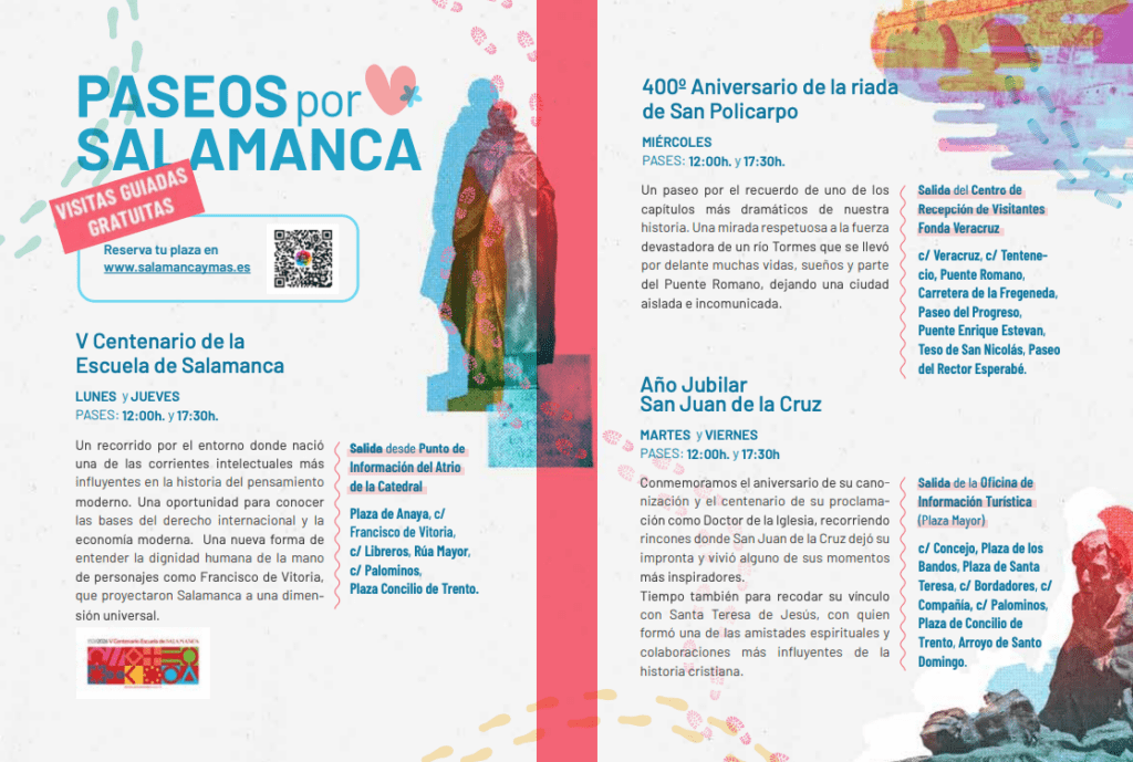 V Centenario de la Escuela de Salamanca (lunes y jueves). Un recorrido por el entorno donde nació una de las corrientes intelectuales más influyentes en la historia del pensamiento moderno. Una oportunidad para conocer las bases del derecho internacional y la economía moderna y una nueva forma de entender la dignidad humana de la mano de personajes como Francisco de Vitoria, que proyectaron Salamanca a una dimensión universal.