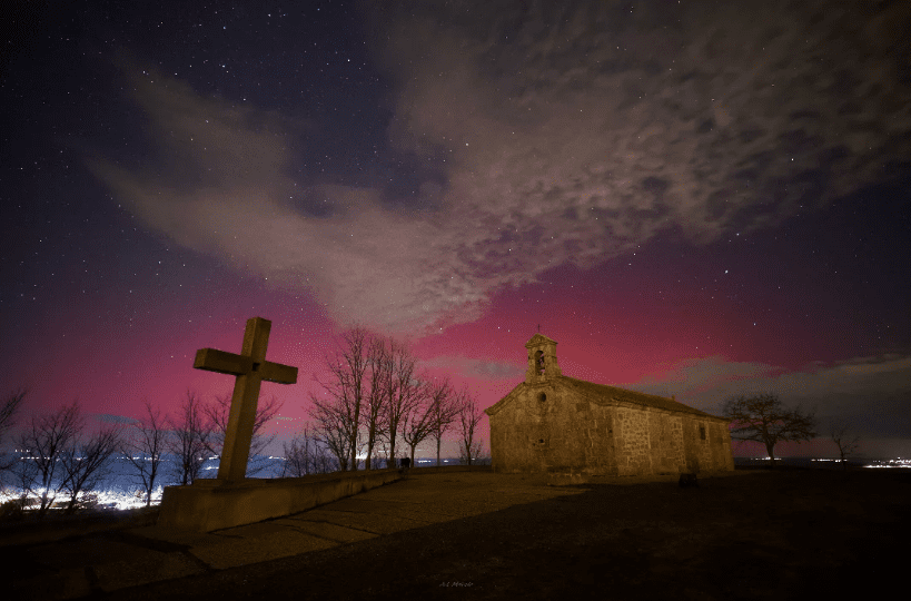 La fotografía de hoy es de Álvaro López. Imagen nocturna de la vista de auroras boreales desde la ermita de Nuestra Señora del Viso en Monterrubio de la Armuña.
