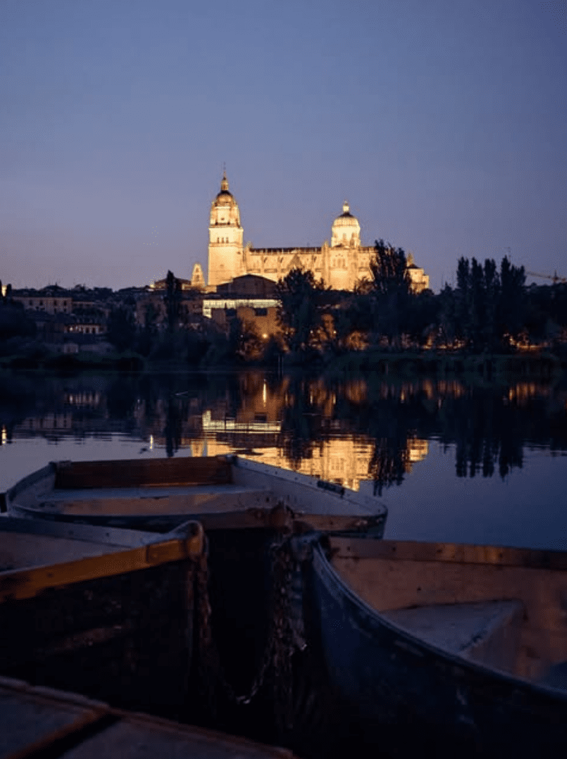 La fotografía de hoy es de Luis Alburquerque. Imagen nocturna de la Catedral de Salamanca desde el embarcadero del río Tormes.