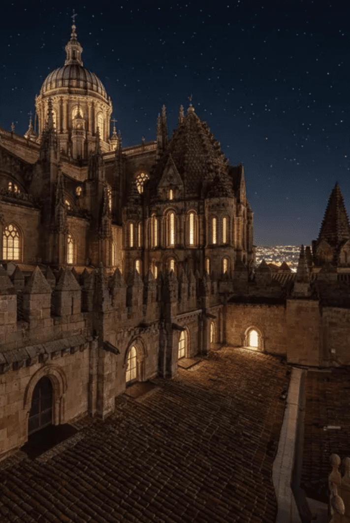 La fotografía de hoy es de Miguel Pedraza. Imagen nocturna desde lo alto de la Catedral de Salamanca con la Torre del Gallo y la cúpula de la Nueva.